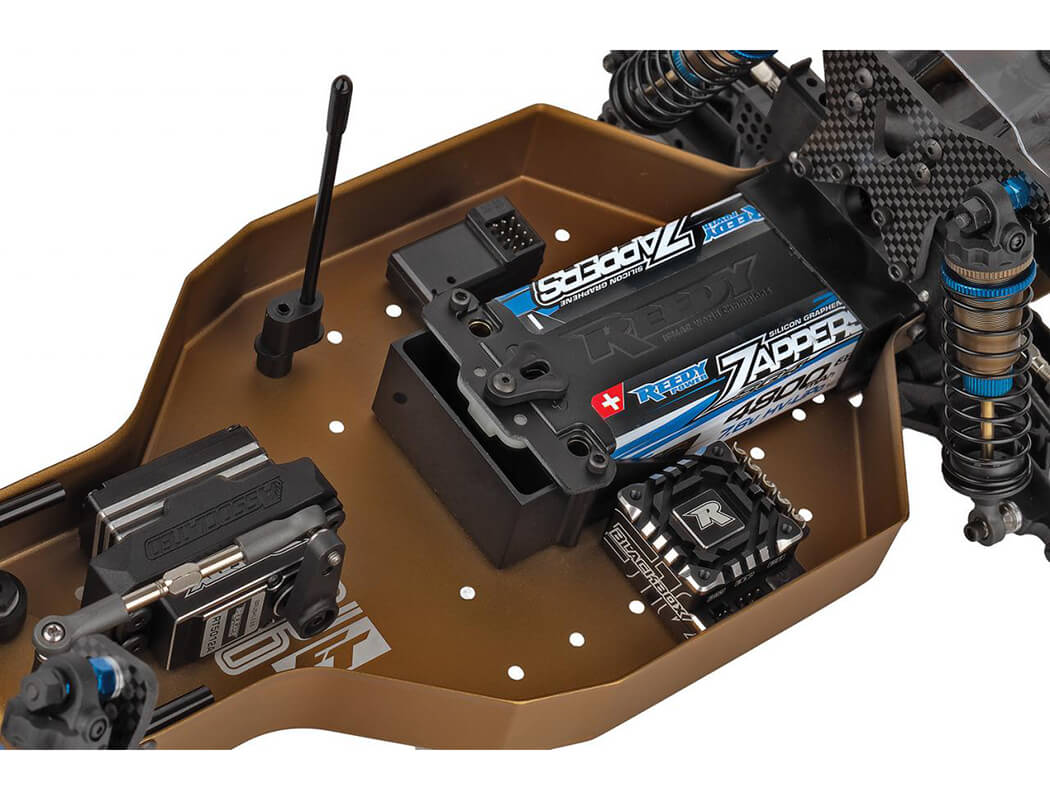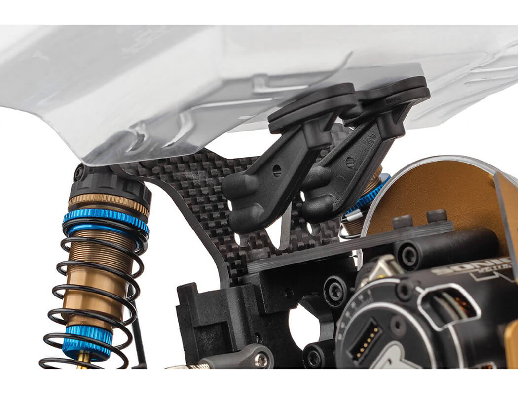 The features in this kit are exactly how our Factory Team drivers setup their RC10’s for modern racing. With big bore shocks, captured hinge pins, 12mm wheel hex’s, exclusive chassis color, all new Mirage Pro body and more, this is an RC10 like never before.