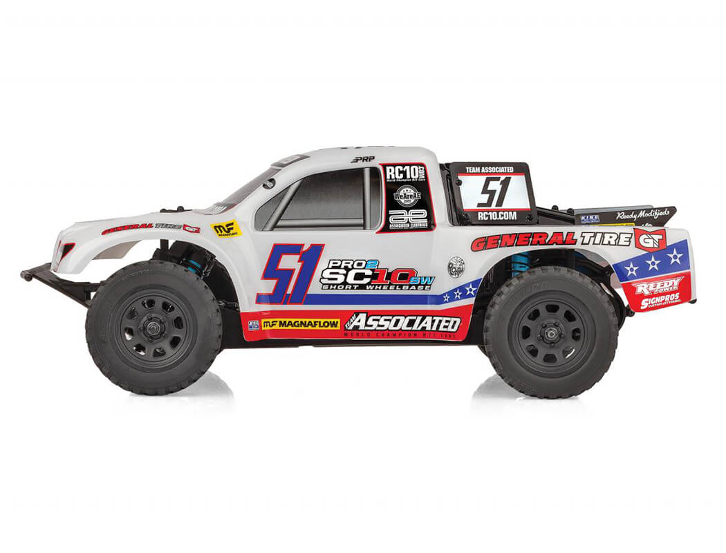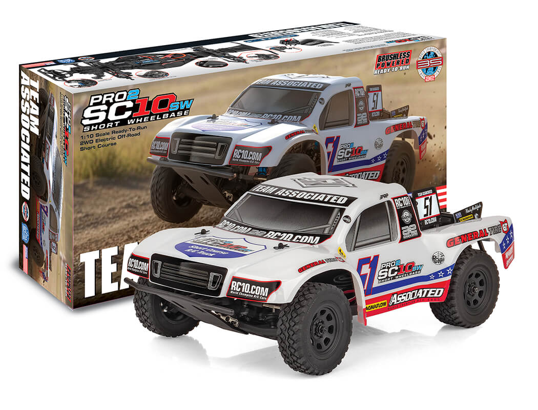 Team Associated’s new Pro2 SC10SW short course truck is a detailed and fun-to-drive Ready-to-Run RC truck. Based on our championship-winning Short Course truck, the Pro2 SC10SW features some of the latest features in racing. A durable lightweight aluminium top shaft, rugged steel turnbuckles and adjustable suspension geometry give the Pro2 SC10SW the ultimate in handling on all terrain. This makes it a perfect platform for short course racing!