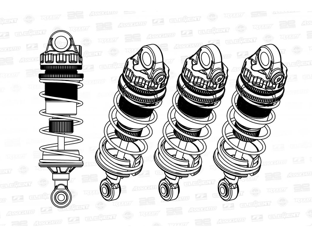 - 4 x 13mm Big Bore shocks: 23mm shock bodies and 21mm shock shafts with X-rings.
