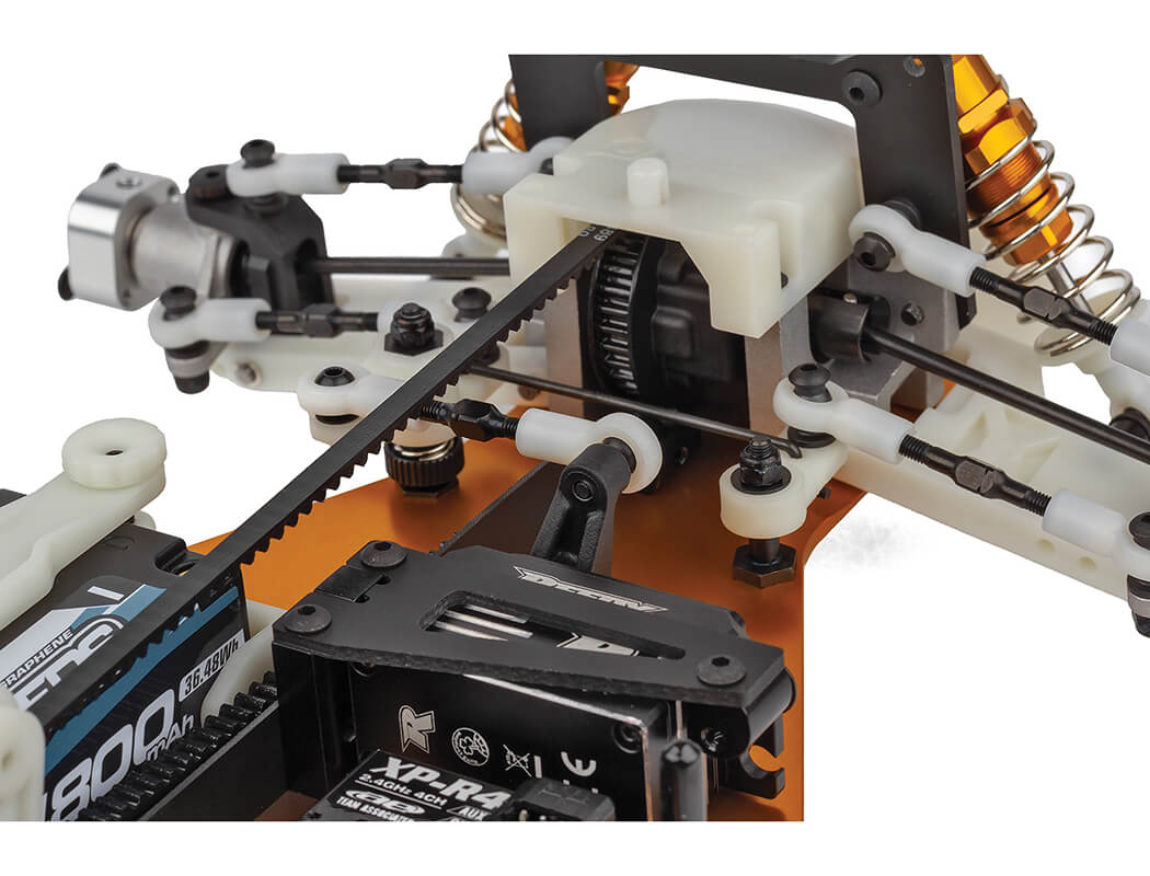 With a very efficient 2-belt drive system, the YZ-10 includes a gear differential, slipper clutch, and universal drive shaft. Saddle mount battery pack for better weight distribution.