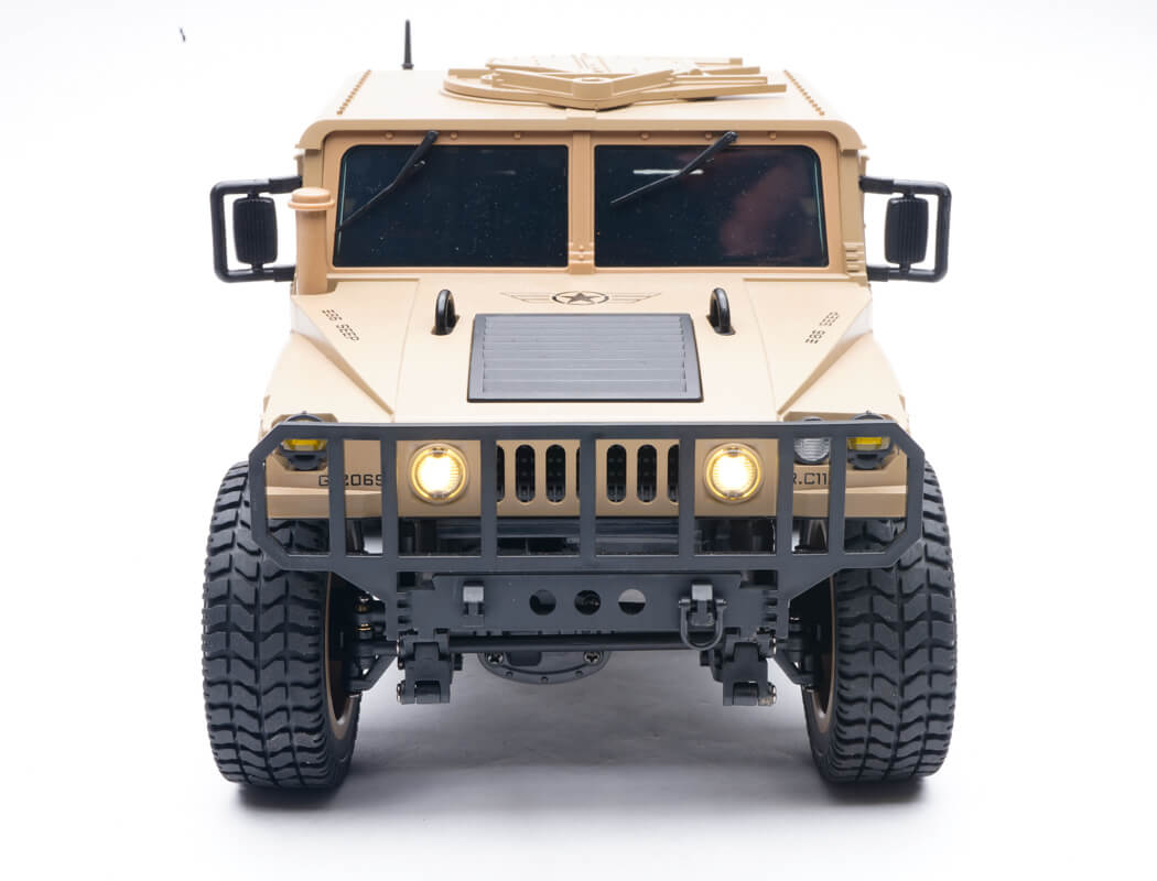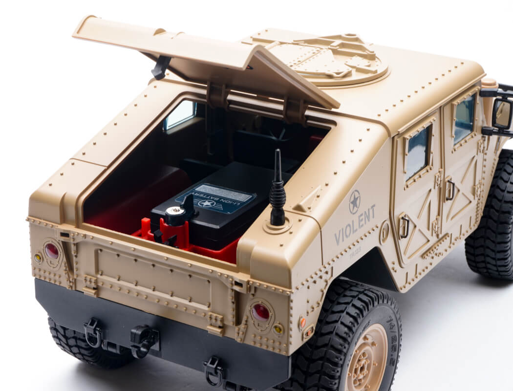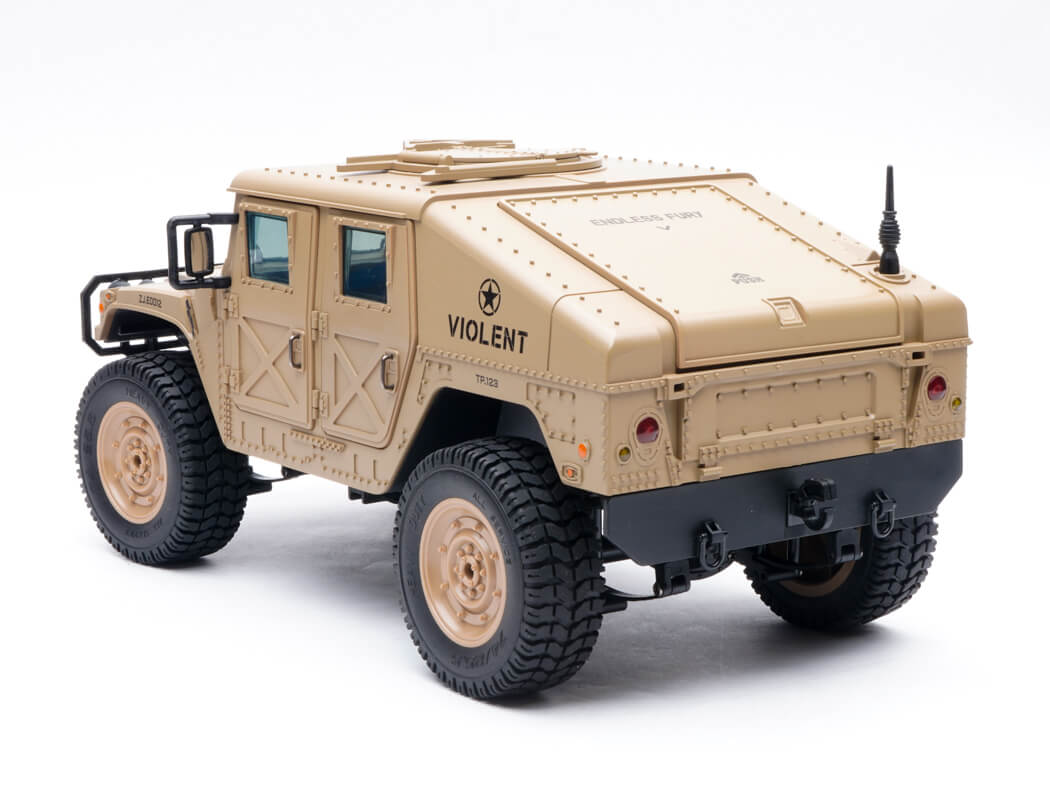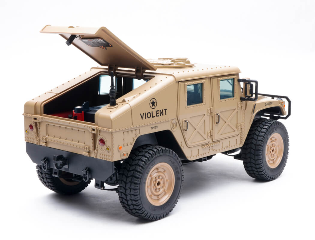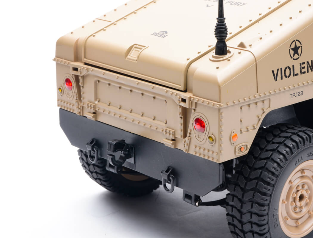 Built around a metal twin frame robust chassis and brushed motor driven shaft 4wd system, this model delivers reliable performance and strong traction across uneven terrain. The realistic military-style body shell features authentic detailing including protective bumpers, opening doors, truck and hatch, scale accessories and working LED headlights that bring the vehicle to life during day or night driving.