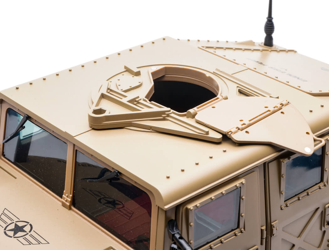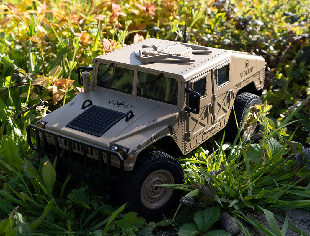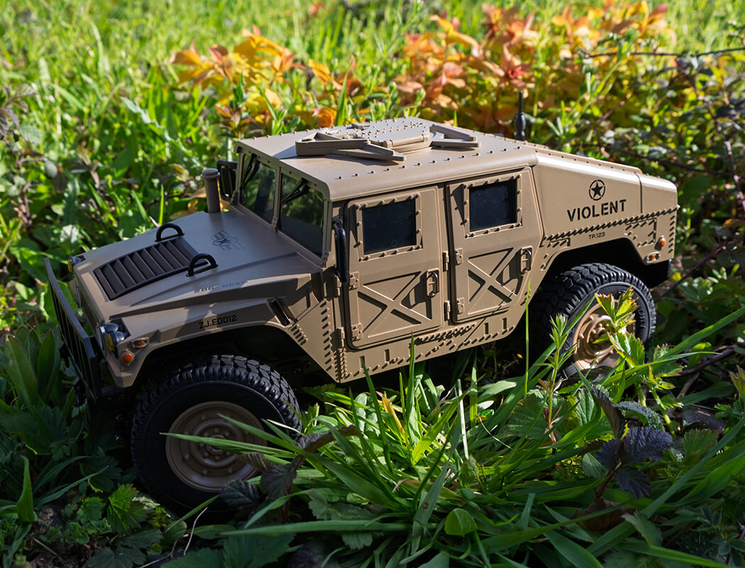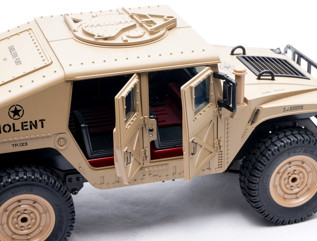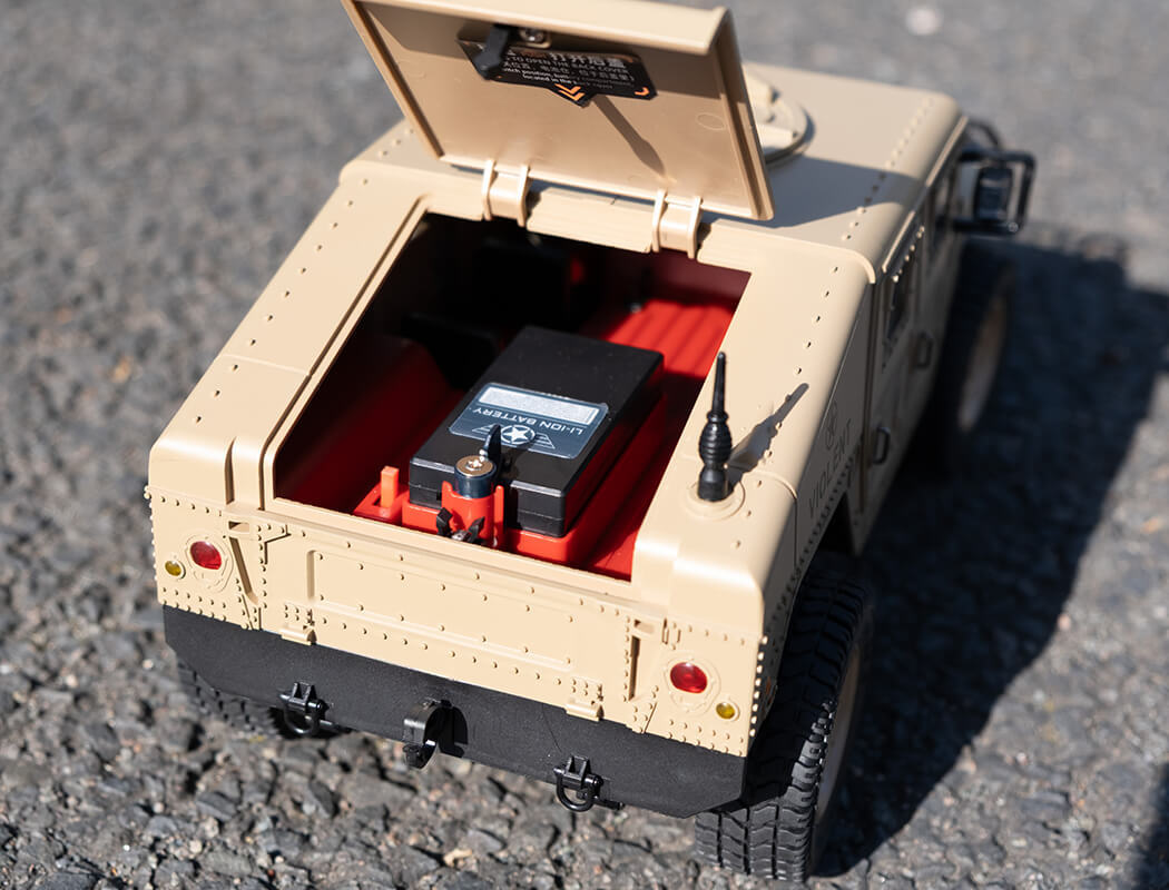 Built around a metal twin frame robust chassis and brushed motor driven shaft 4wd system, this model delivers reliable performance and strong traction across uneven terrain. The realistic military-style body shell features authentic detailing including protective bumpers, opening doors, truck and hatch, scale accessories and working LED headlights that bring the vehicle to life during day or night driving.