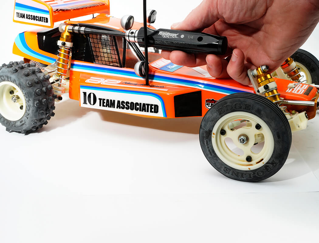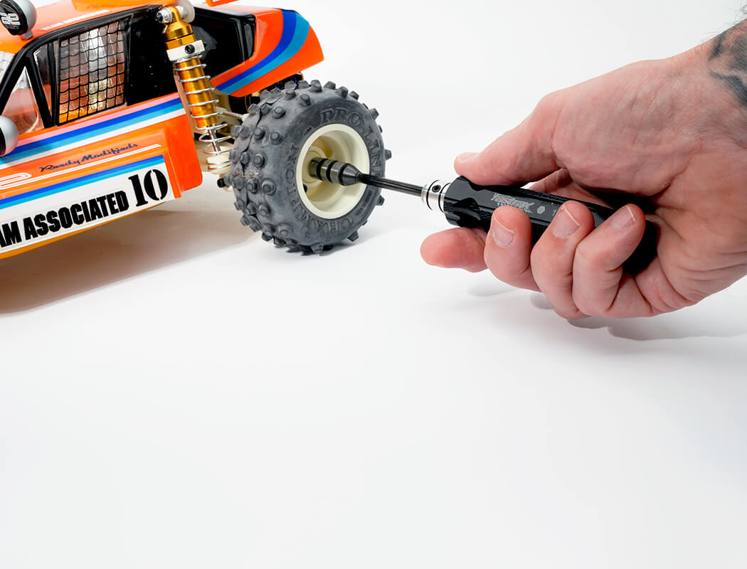 Machined aluminium handle and hardened nut driver, suitable for front wheels and shock mounting 4-40UNC sized nuts as used on Team Associated 2wd RC10 vintage buggies and trucks