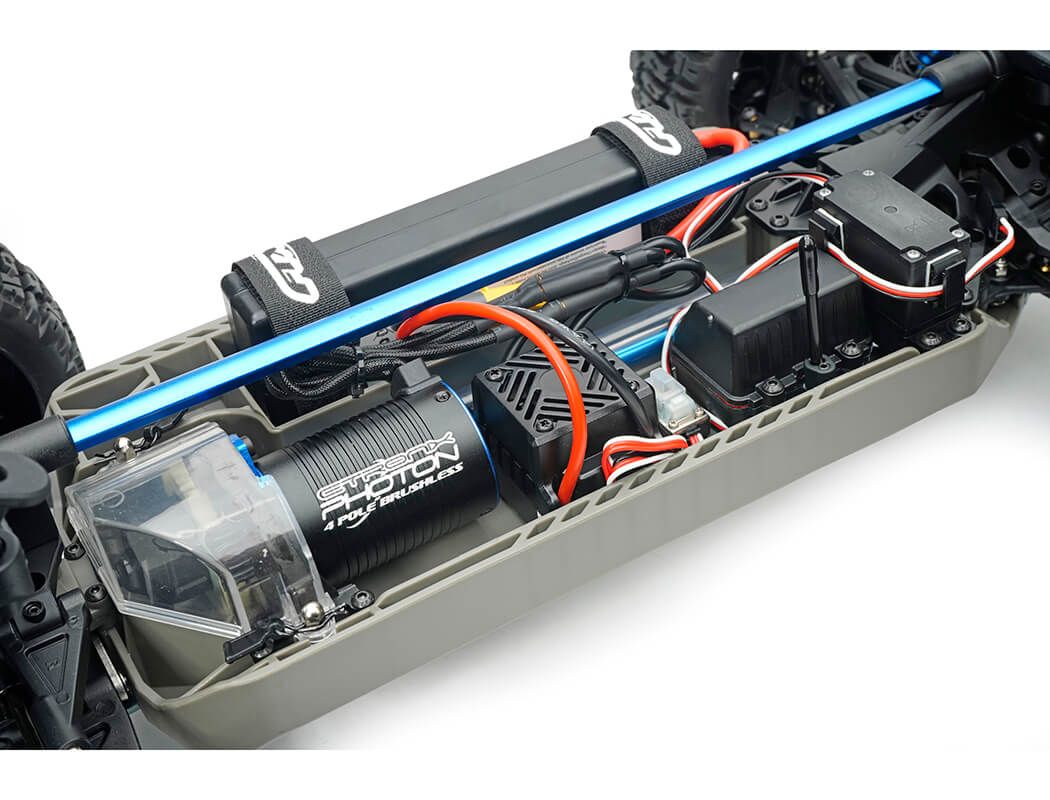 Powering the sealed, shaft-driven 4WD system is a Voltz 3S LiPo battery, Hobbywing 50A speed controller now with XT60 connectors and an Etronix 2500Kv brushless motor, providing exhilarating high-speed performance across dirt, gravel, and rough terrain.