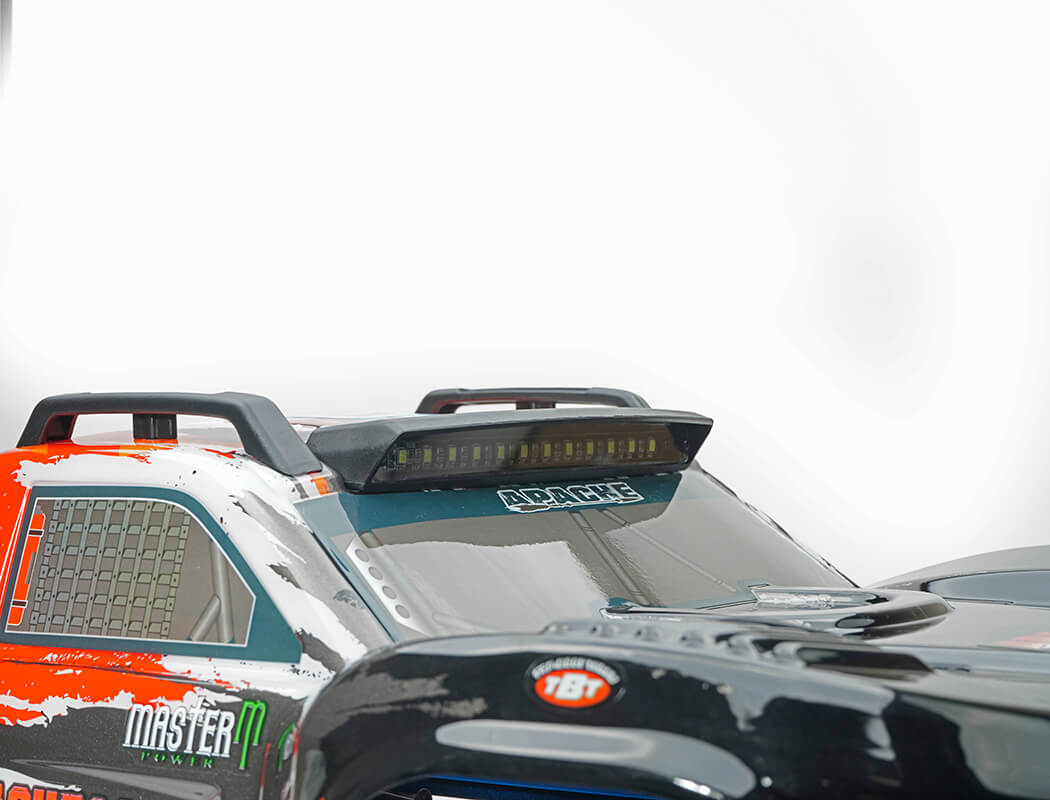 Completing the package is the Apache’s stylish semi-scale Trophy Truck bodyshell, fi ished with impactful graphics in either blue or red. Scale details include moulded roof skid rails, an LED light bar, body post reinforcement plates, and new rear bumper mud flaps.