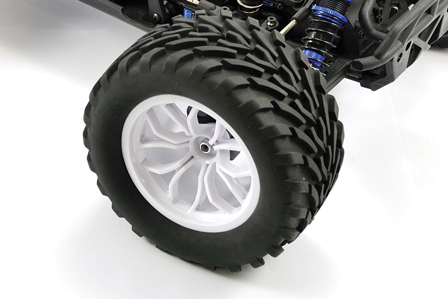 The 4wd shaft drivetrain features metal diff gears and front universal driveshafts, while an integrated slipper helps protect the drivetrain from possible damage under power. With adjustable turnbuckles all round and large bore oil filled shock absorbers the Bugsta can be tuned to suit you or the surface.