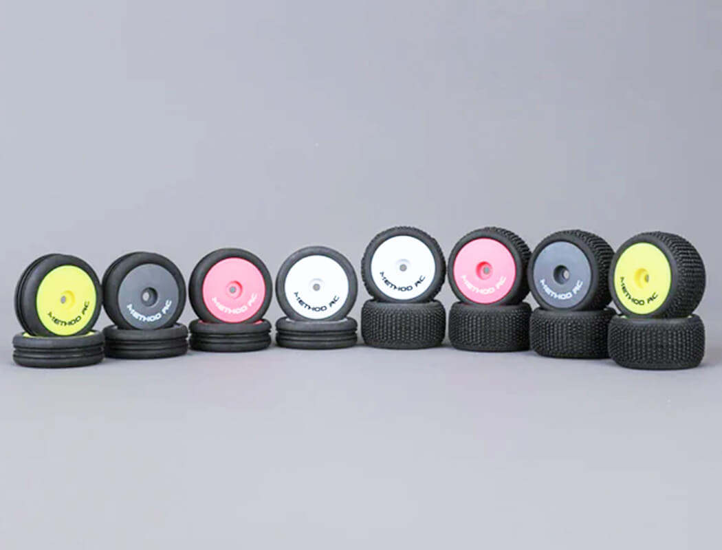 The METHOD RC NitraGrip Striped Narrow Front & Nano Stud Rear Nitrile Rubber Tire Set is specially designed for the 1/24 scale Micro-B buggy platform, delivering exceptional performance on a variety of indoor and outdoor surfaces. Made from premium nitrile rubber — a signature material of the NitraGrip series — these tires offer excellent durability and superior grip, tailored specifically for small-scale buggy racing.